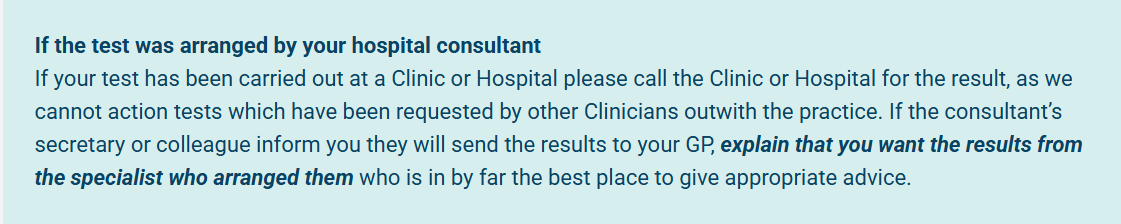 Please note that we do have a strict policy regarding confidentiality and data protection. We will only give out results to the person they relate to, unless that person has given prior permission for their release or if they are not capable of understanding them.